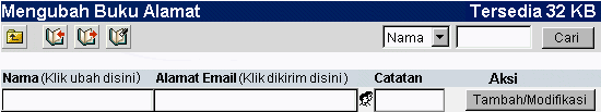 | Buku Alamat adalah database kecil dari setiap kontak email yang biasanya digunakan oleh anda, yang mengijinkan anda untuk mendapatkan akses yang cepat dan mudah pada setiap saat. Tetapi, buku alamat memiliki dua (2) mode yang berbeda untuk digunakan. Mode Ubah, digunakan untuk membuat entri pada buku alamat, menghapus, mengubah dan mengunakan fitur lanjutan. Kemudian Menggunakan Mode yang mengijinkan anda untuk secara langsung menambahkan informasi catatan atas lengkap email (Penerima, Judul pesan, dan lain-lain) ke dalam pesan email yang keluar.
