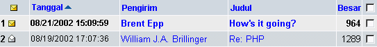 Kotak Checkbox di dalam kolom yang terakhir adalah untuk memilih dan aksi dari pesan. Dengan meng-klik salah satu kotak checkbox, tanda checkmark mark kecil akan muncul di dalam kotak checkbox tersebut. Dengan meng-klik kotak itu kembali, akan menghilangkan tanda checkmark kecil tersebut. Dengan meng-klik kotak checkbox yang paling atas (anda akan diarahkan pada kolom "Besar"), dan semua kotak checkbox yang berada di bawah akan terpilih. Alat ini digunakan untuk melakukan aksi pada pesan yang terpilih. Hal ini akan dibahas lebih lanjut di dalam topik Menggunakan Toolbar. |